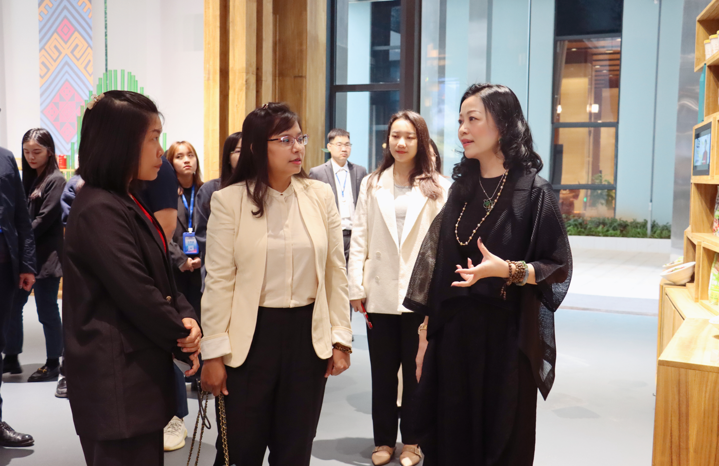 在參觀匯聚中心17個國家及地方特色展館過程中,趙海燕董事長介紹了匯聚中心展館如何通過人文設(shè)計(jì)理念烘托出各國當(dāng)?shù)靥厣a(chǎn)品,以沉浸式的獨(dú)特商品貿(mào)易體驗(yàn)促進(jìn)交易。作為匯聚中心精心打造的國家主題展館,緬甸館以該國傳統(tǒng)特色文化為基調(diào),巧妙融合本地風(fēng)土人情元素打造的“金色緬甸”效果,贏得了高凱玨參贊的認(rèn)可。她表示緬甸館不僅設(shè)計(jì)別出心裁,而且能夠在一定的空間里盡可能地將緬甸多元文化與特色產(chǎn)品展示出來,可見項(xiàng)目策劃人所費(fèi)的心思不一般。